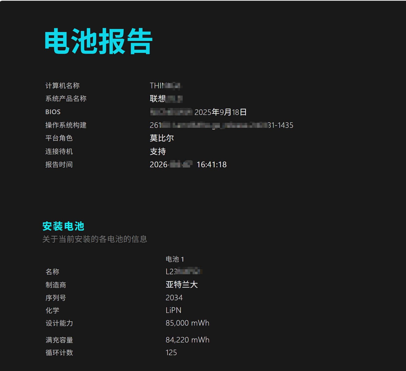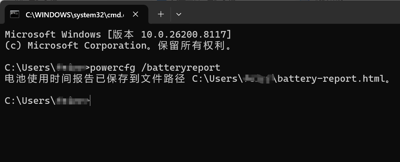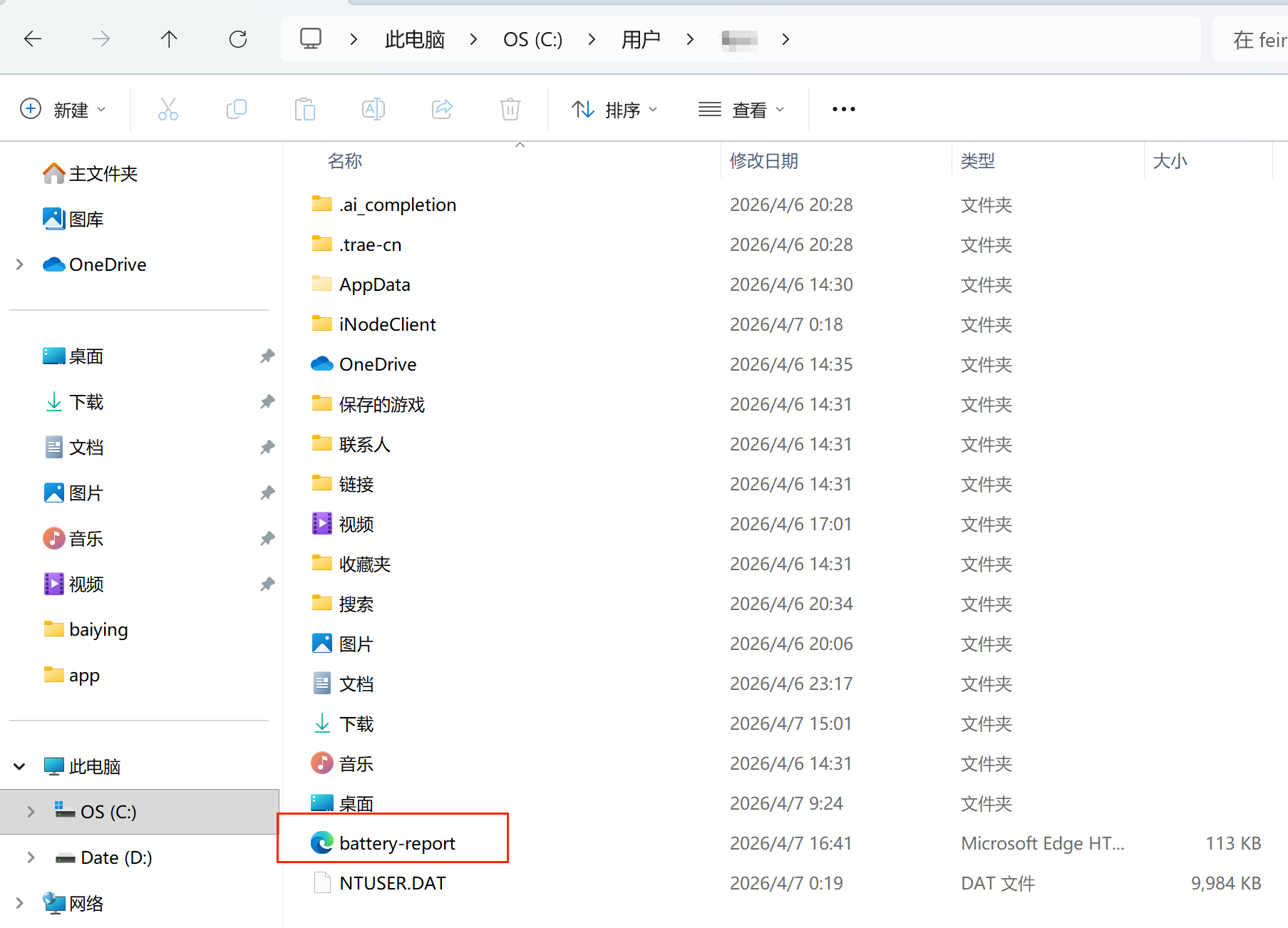 PlainText复制电池寿命报告已保存到: C:\Users\<用户名>\battery-report.html复制该完整路径。
