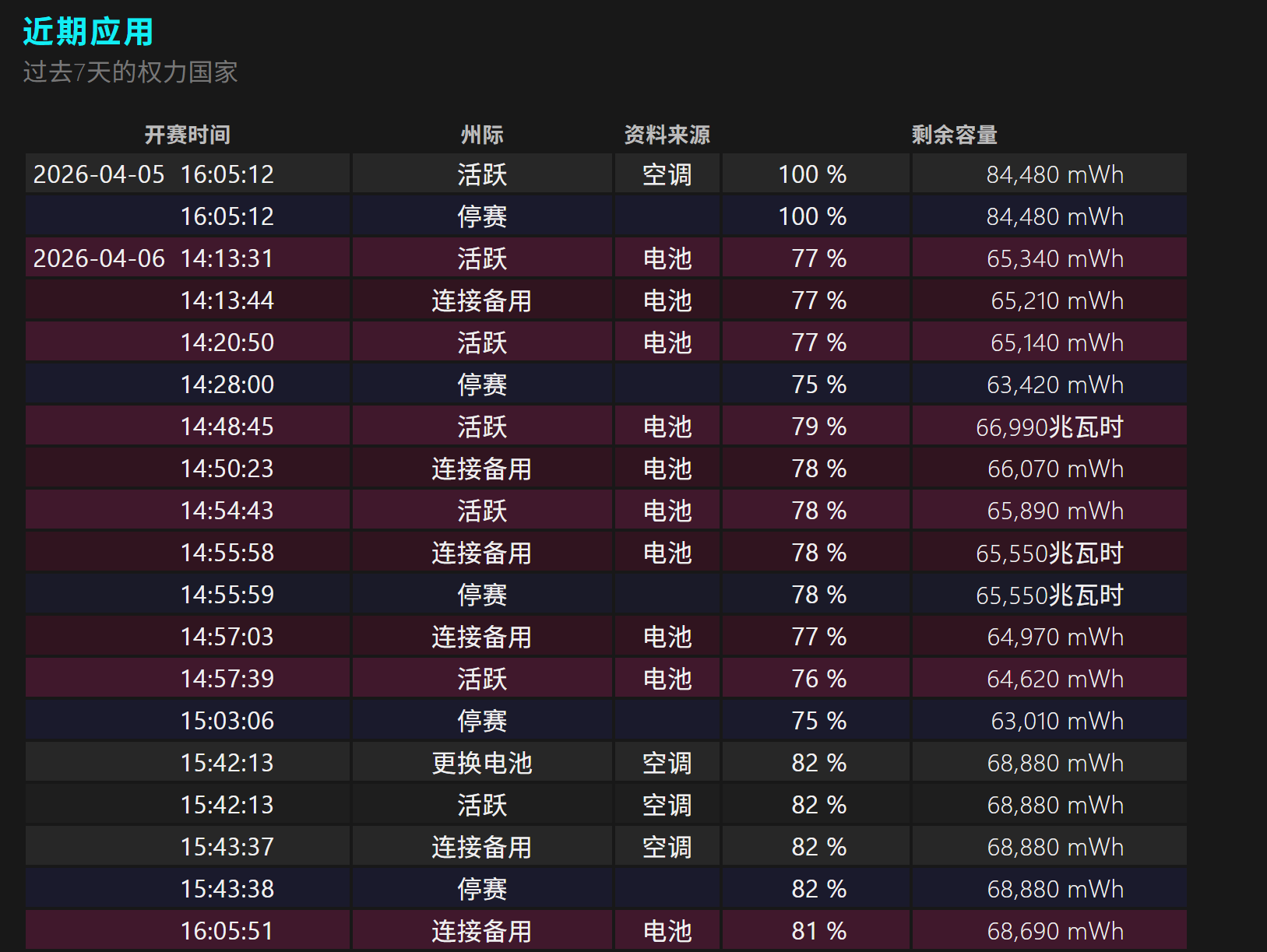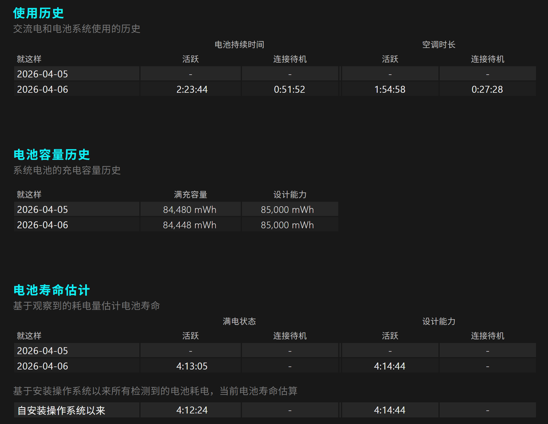 该方法直接调用 Windows 电源管理子系统,生成包含设计容量、当前满充容量、充电周期、近期使用记录等关键指标的 HTML 报告,适用于所有 Windows 10/11 设备。