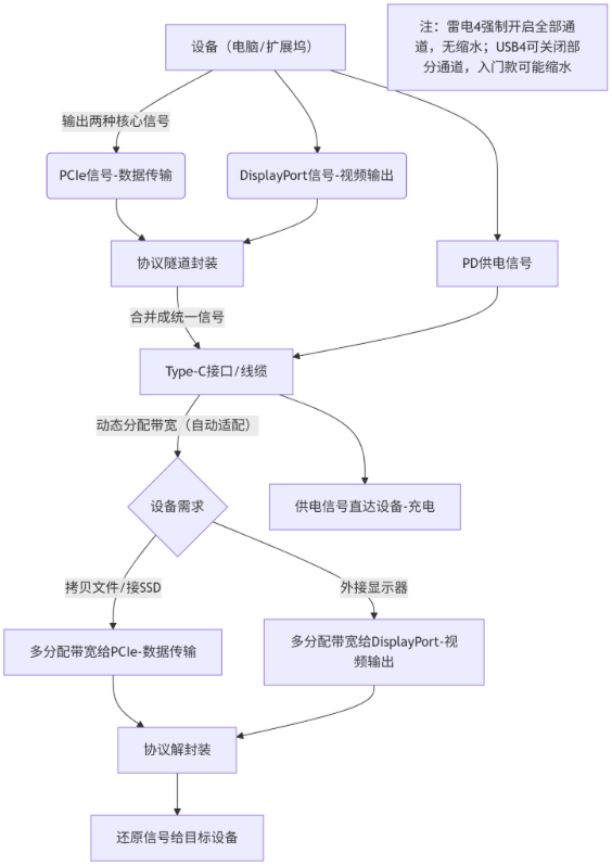 不管是USB4还是雷电4,底层核心都是“协议隧道+带宽复用”,简单说就是“一条Type-C线,同时跑多种信号,互不干扰”,具体原理很容易理解,用流程图可直观看清: