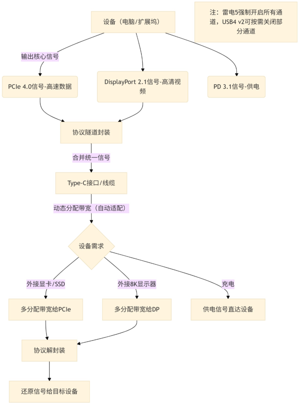 简单说:就是把高速数据、高清视频、供电三种信号,通过“协议隧道”打包成统一信号,用一条Type-C线传输,根据设备需求自动分配带宽,两者的区别仅在于“是否强制开启所有通道”,技术本身完全一致。